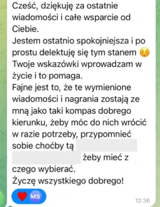 ✅ Dostajesz ode mnie głosowe odpowiedzi i wskazówki do każdej sytuacji – konkretne, szybkie, dopasowane do tego, co właśnie przeżywasz.