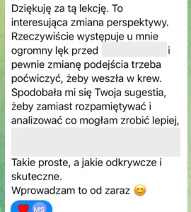 ✅ Szybciej zaczynasz widzieć powtarzające się schematy, rozumiesz mechanizmy, które zjadają Twój spokój – nie po miesiącach, tylko w ciągu dni;
