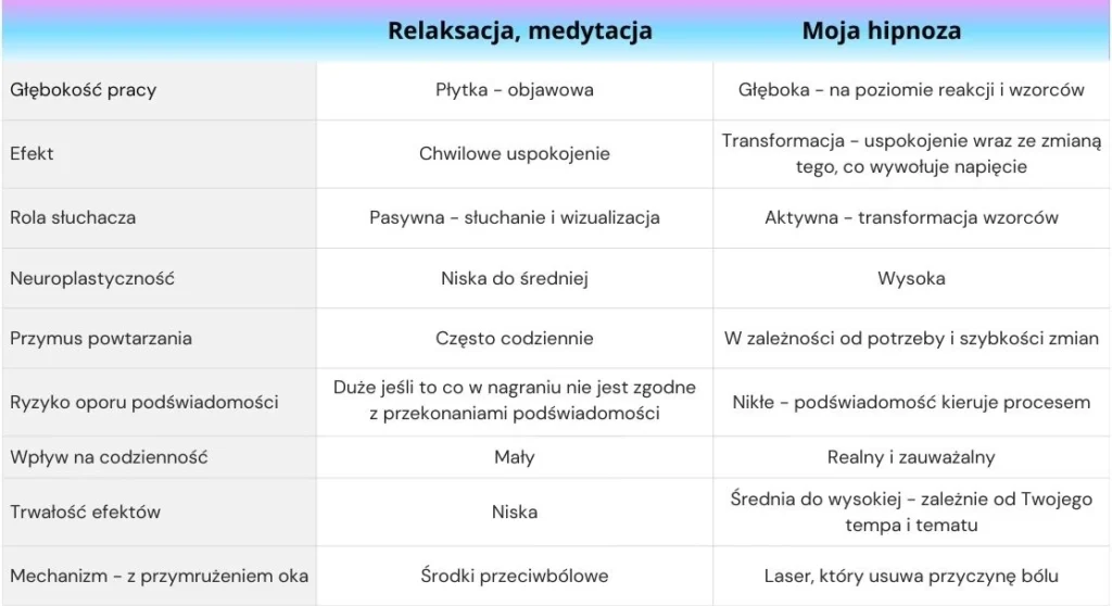 Zobacz co oferują Ci inne relaksacje, medytacje, albo i nawet produkty reklamujące się jako hipnoza, ale zawierająca w sobie jedynie wizualizacje działające na objaw bądź afirmacje typu „otwierasz się na spokój”, „żegnasz swój lęk”: